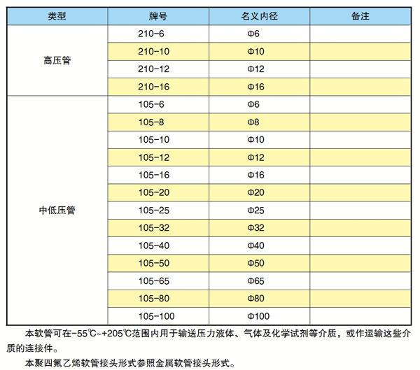 聚四氟乙烯軟管(鐵氟龍)類型與牌號對照表